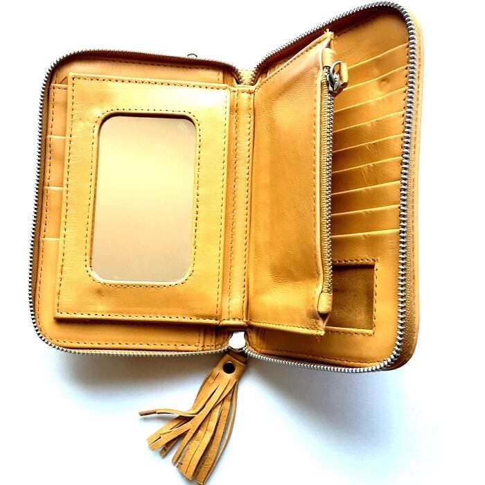 ボヘミアン 本革 レザー タッセル付 ウォレット(ナチュラル×ターコイズグリーン編込み)ミラー付 財布 長財布 パスポート入れ【バリ直輸入】