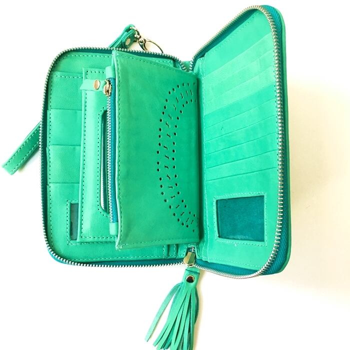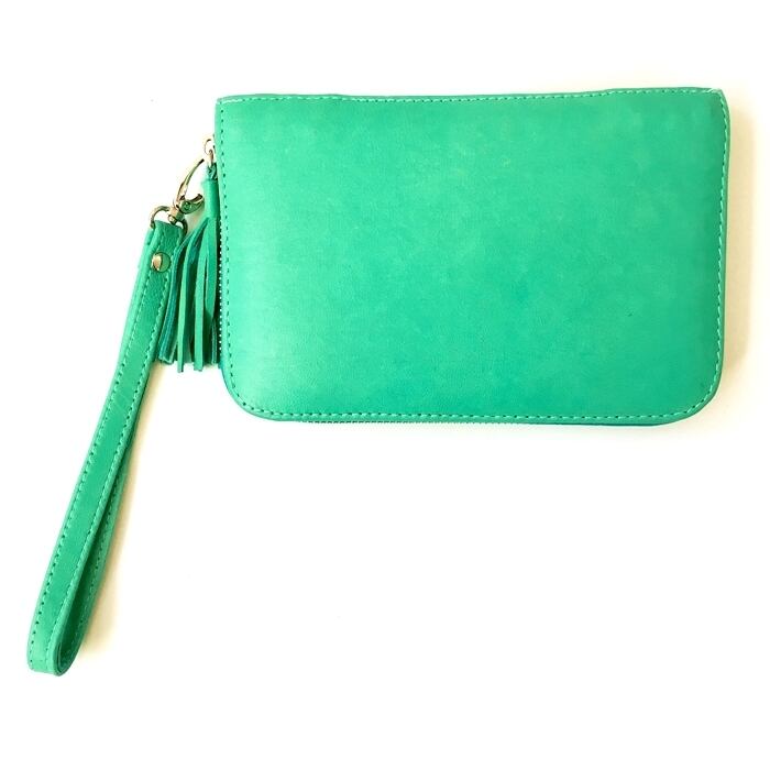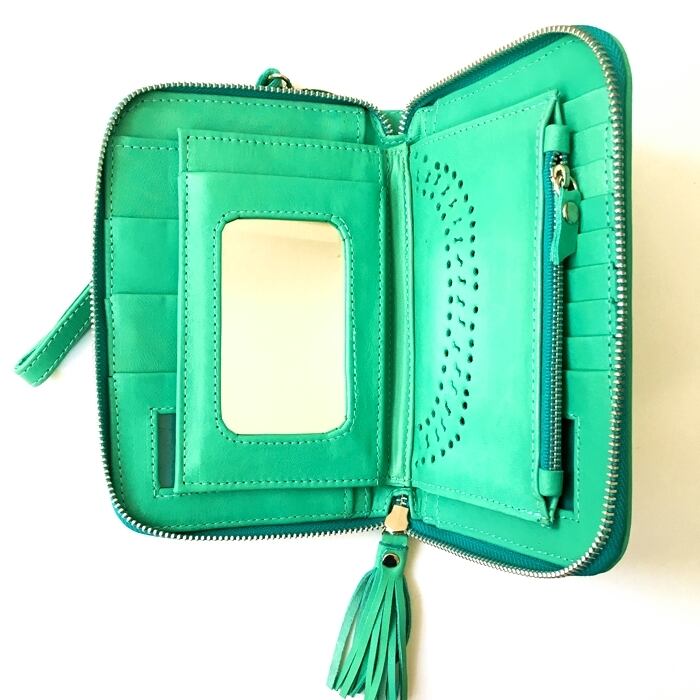 ボヘミアン 本革 レザー タッセル付 ウォレット(ターコイズグリーン×スタッズ)ミラー付 財布 長財布 パスポート入れ 【バリ直輸入】