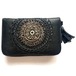 センターにはマンダラ模様の型押しが施され、その周りを同色のレザーで刺繍が施されたアクセントがかわいいお財布。