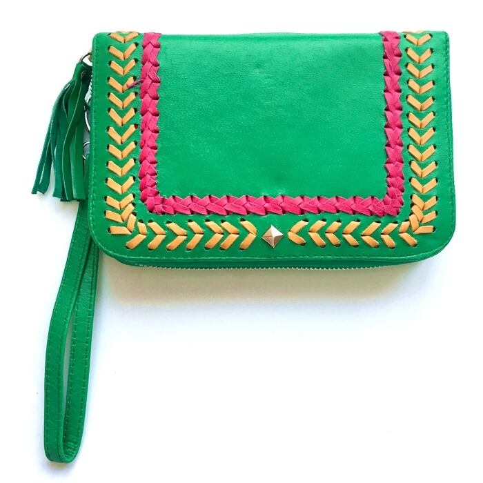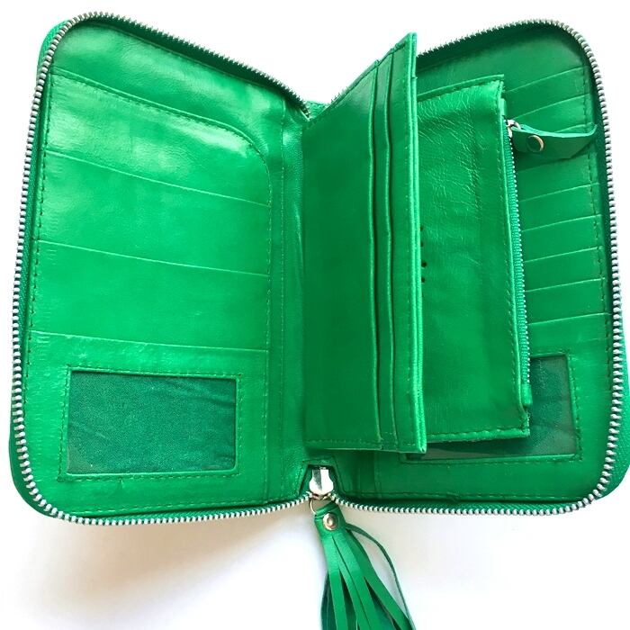 ボヘミアン 本革 レザー タッセル付 ウォレット(グリーン×ステッチ刺繍×マンダラ柄) ミラー付 財布 長財布 パスポート入れ【バリ直輸入】