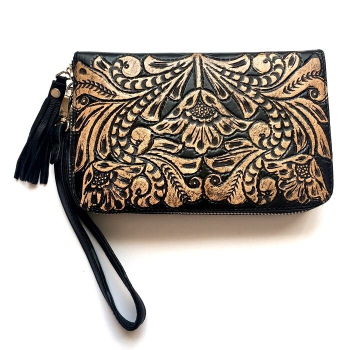 ボヘミアン 本革 レザー タッセル付 ウォレット(黒 カービング×ターコイズ) ミラー付 財布 長財布 パスポート入れ【バリ直輸入】