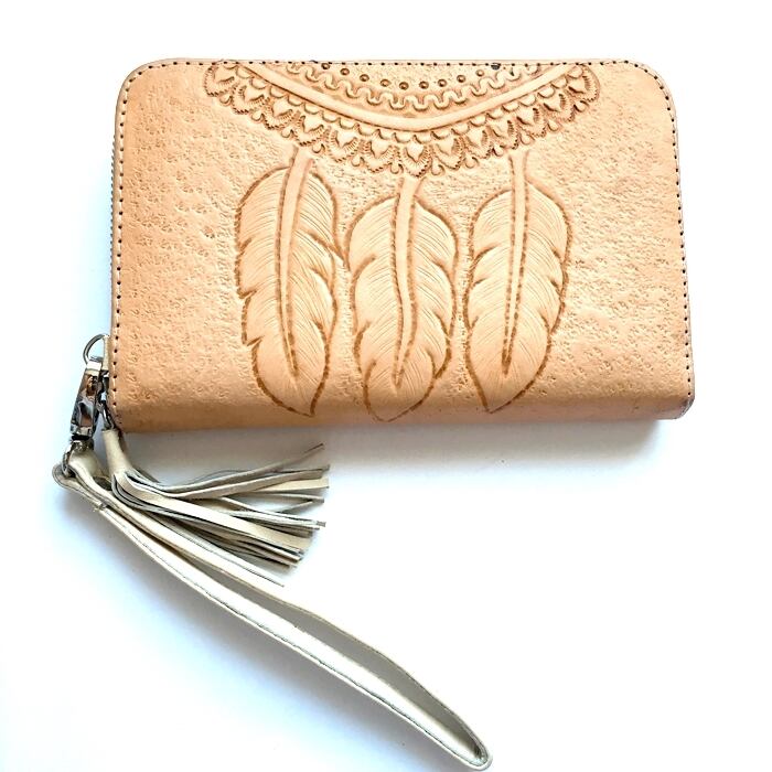 ボヘミアン 本革 レザー タッセル付 ウォレット(フェザー型押し×アイボリー) ミラー付 財布 長財布 パスポート入れ【バリ直輸入】