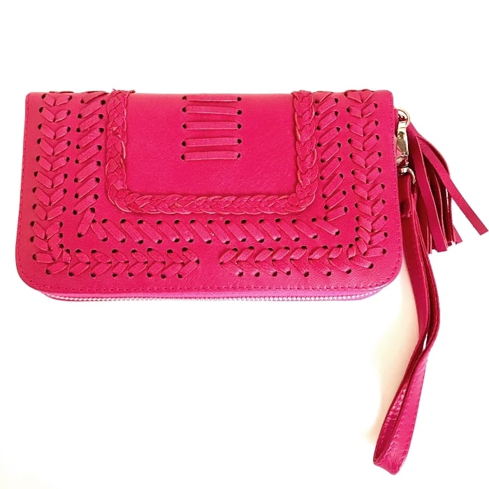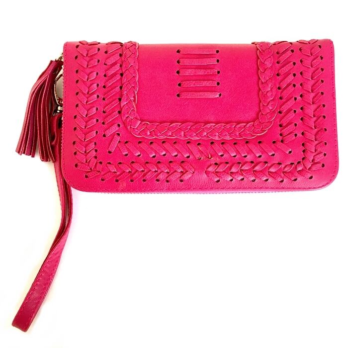 ボヘミアン 本革 レザー タッセル付 ウォレット(ピンク刺繍) 財布 長財布 パスポート入れ【バリ直輸入】