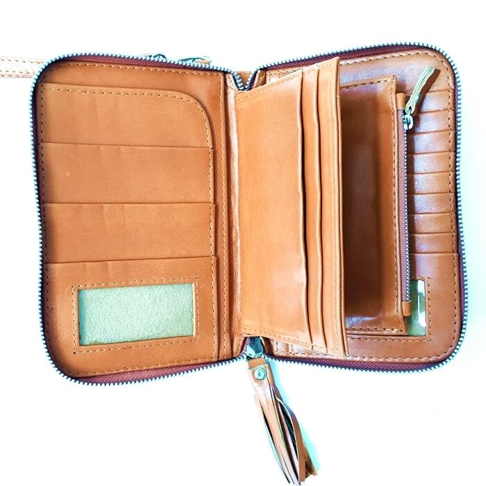 ボヘミアン 本革 レザー タッセル付 ウォレット(ターコイズ×キャメル×マンダラ柄) ミラー付 財布 長財布 パスポート入れ【バリ直輸入】