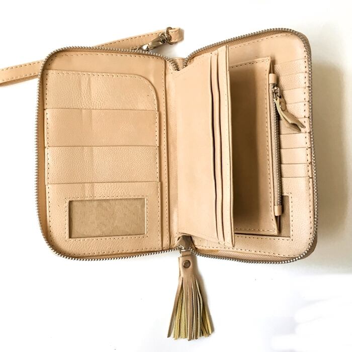 ボヘミアン 本革 レザー タッセル付 ウォレット(ストーン×アイボリー×マンダラ柄) ミラー付 財布 長財布 パスポート入れ【バリ直輸入】