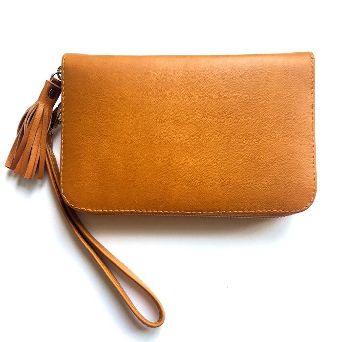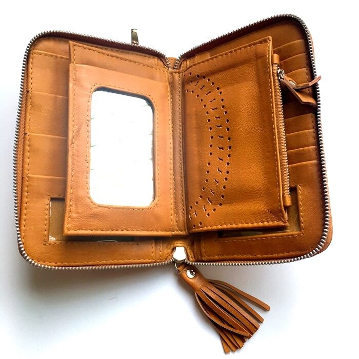 ボヘミアン 本革 レザー タッセル付 ウォレット(ストーン×ブラウン×マンダラ柄) ミラー付 財布 長財布 パスポート入れ【バリ直輸入】