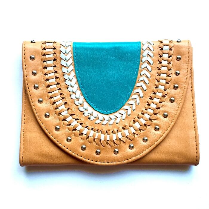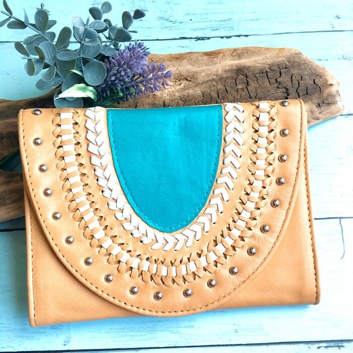 ボヘミアン ハンドメイド レザー ウォレット(ナチュラル×ターコイズスタッズ) 本革 財布 母子手帳ケース パスポート入れ クラッチバッグ【バリ島直輸入】