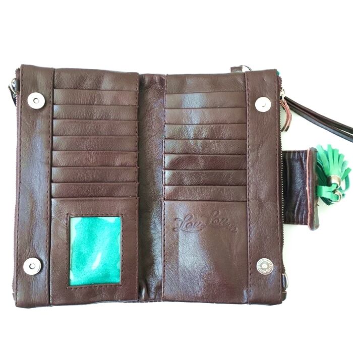 ボヘミアン 本革 タッセル付 ウォレット(茶×グリーンタッセル) 財布 長財布 ショルダー付 パスポート入れ【バリ島直輸入】