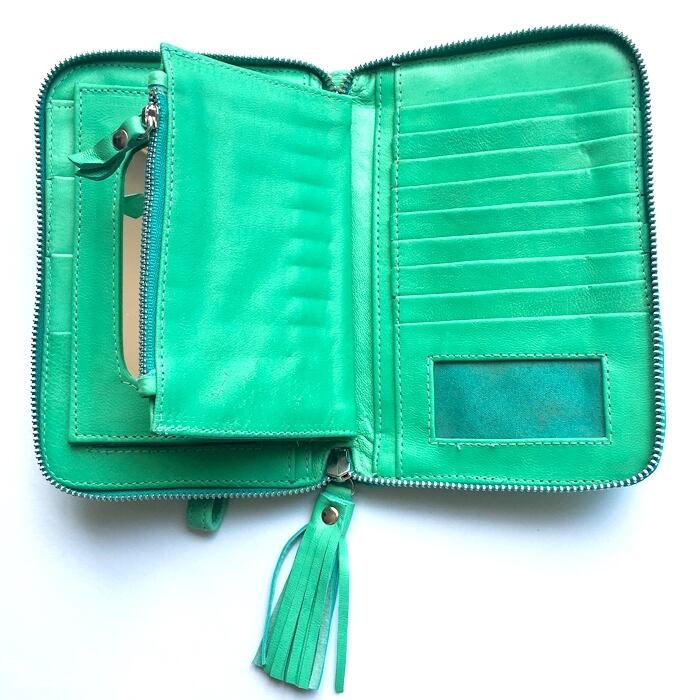 ボヘミアン 本革 レザー ウォレット(tターコイズグリーン×ステッチ刺繍)ミラー付 財布 パスポート入れ【バリ直輸入】