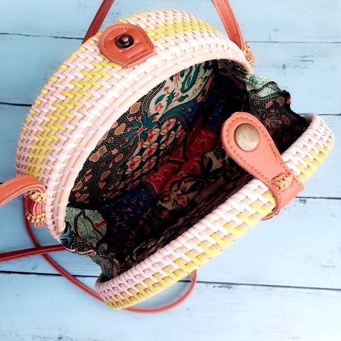 【バリ直輸入】ラウンド ショルダーバッグ(黄色×白×編込み)/丸型カゴバッグ/ストローbag/リゾートバッグ
