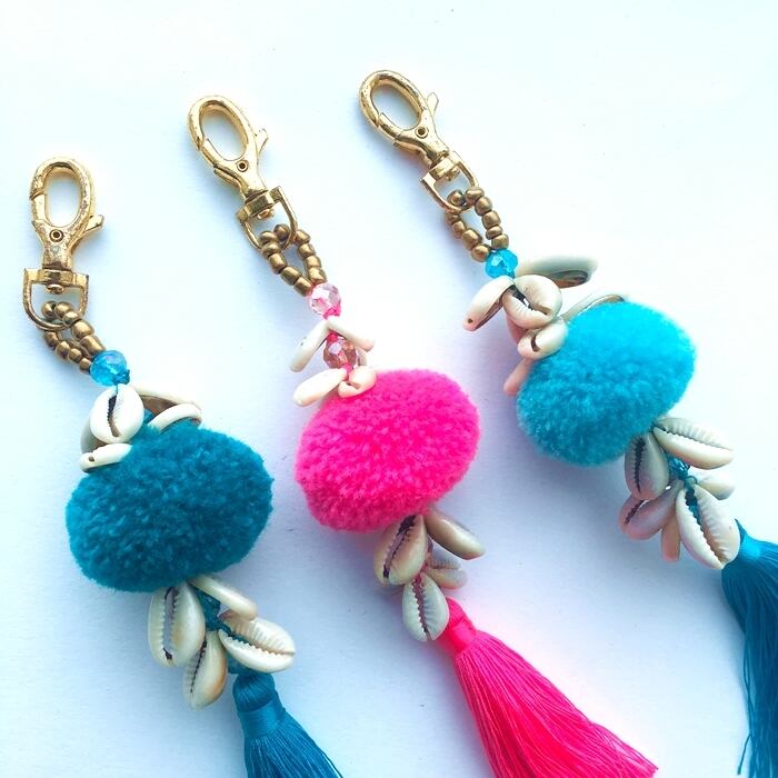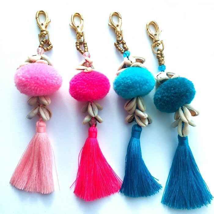 ポンポン タッセル キーホルダー 4色~貝殻付★バッグチャーム/キーリング【バリ島直輸入】