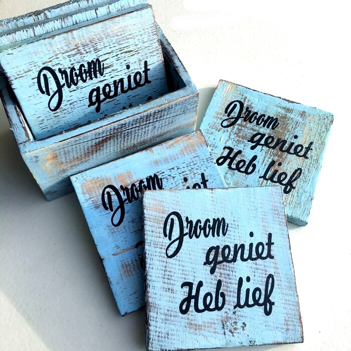 海を感じる メッセージ 木製コースター 6P 収納BOX付(ブルー)【バリ島直輸入】