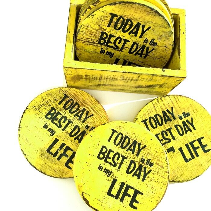 海を感じる メッセージ 丸型木製コースター 6P 収納BOX付(イエロー)【バリ島直輸入】