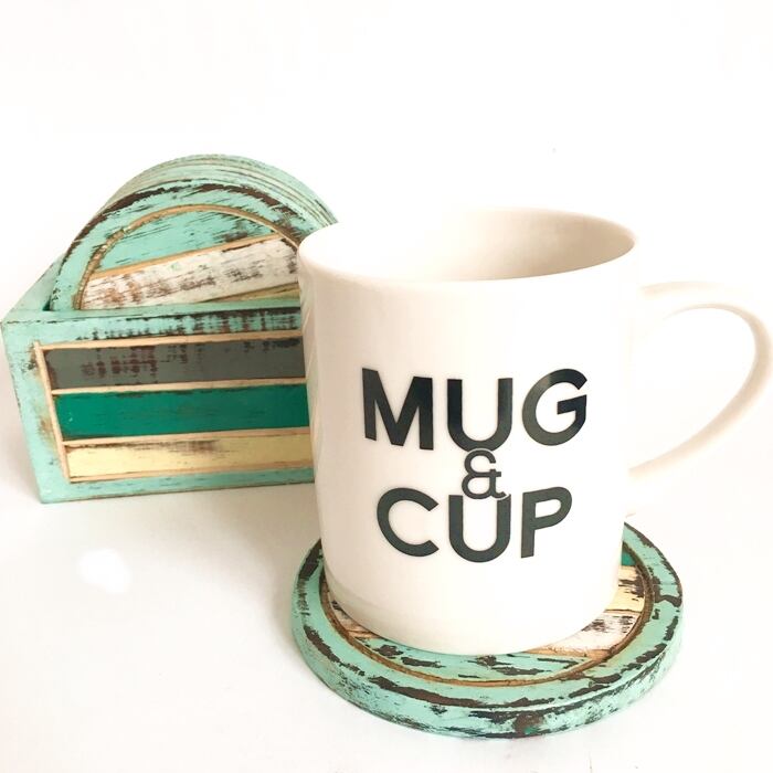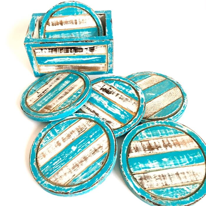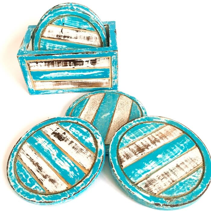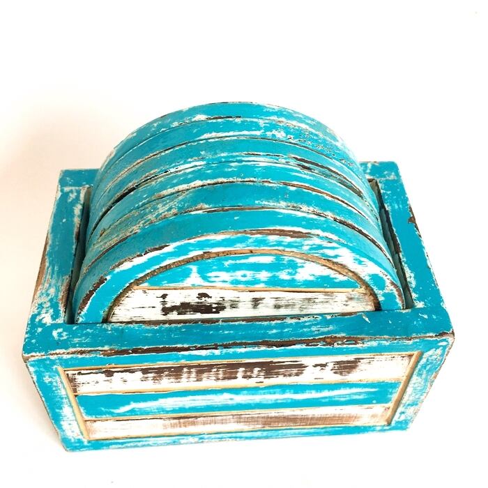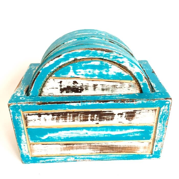 海を感じる 丸型木製コースター 6P 収納BOX付(ブルーmix)【バリ島直輸入】