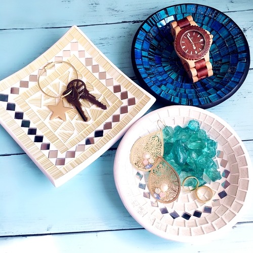 バリ発、テラコッタ(素焼き)のトレーにガラスやミラーを敷き詰め、