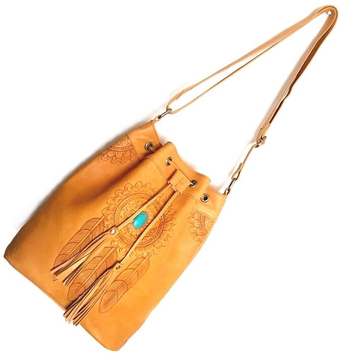 ボヘミアン 本革レザーバッグ ショルダーバッグ バケツ型 (ドリームキャッチャー×キャメル)【バリ直輸入】