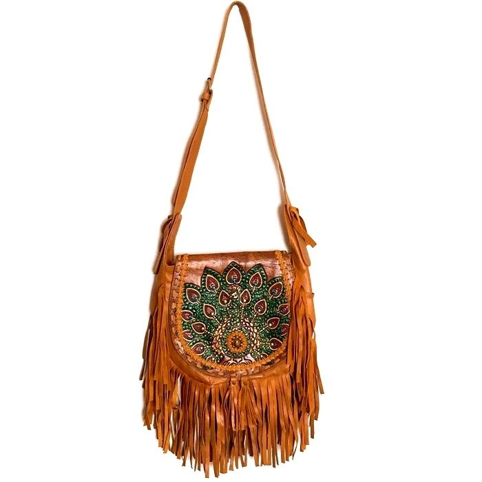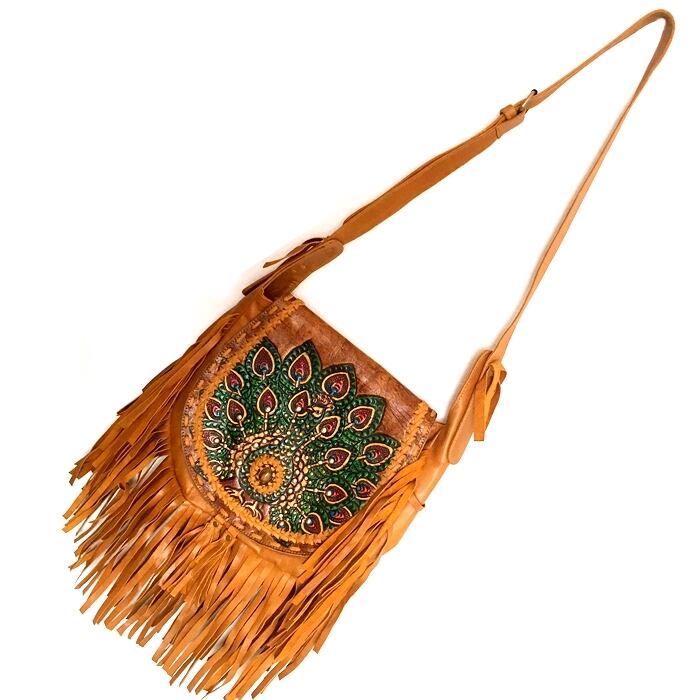 本革 ボヘミアン フリンジショルダーバッグ(ピーコック)ハンドメイド レザー【バリ直輸入】