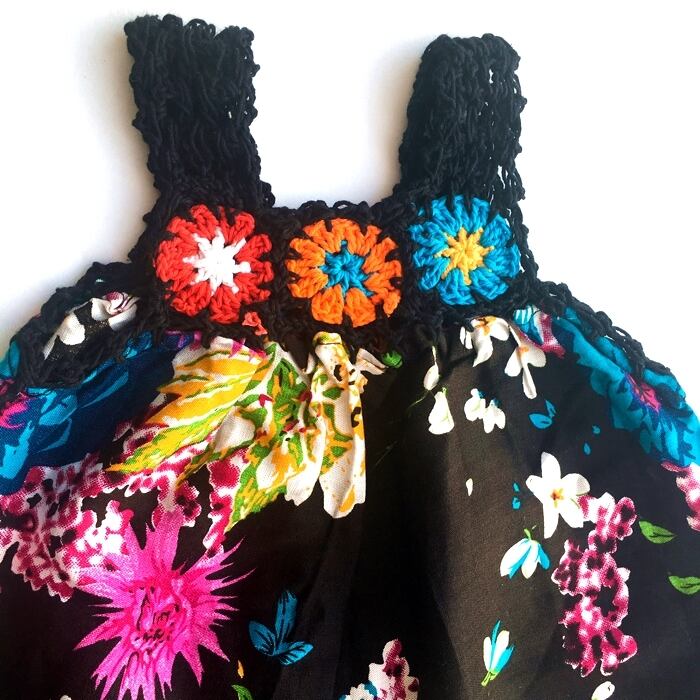 胸元クロッシェ 花柄ワンピース (黒) ★70~80【バリ直輸入】