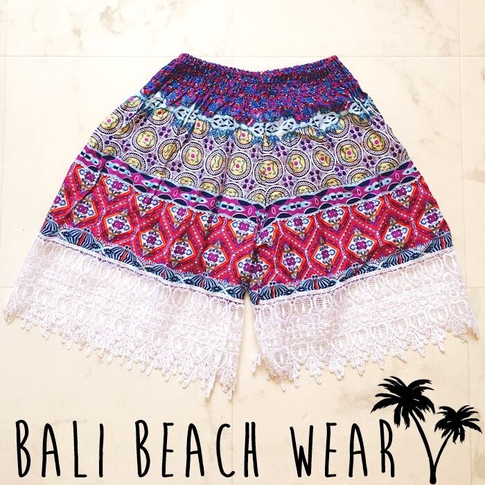 レースフリンジ ショートパンツ(ネイティブ柄/青)リゾート 海 ビーチ【バリ島直輸入】