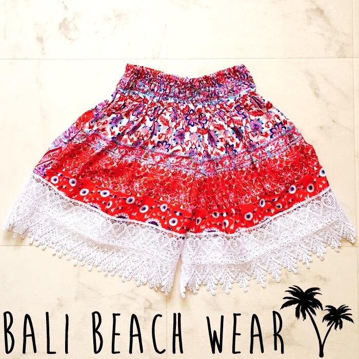 レースフリンジ ショートパンツ(フラワー柄/赤)リゾート 海 ビーチ【バリ島直輸入】