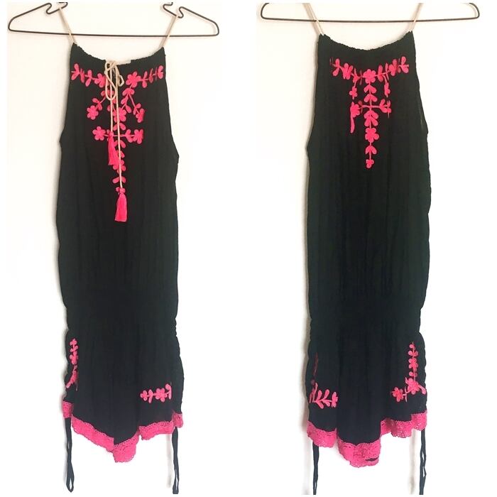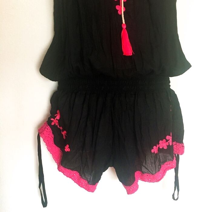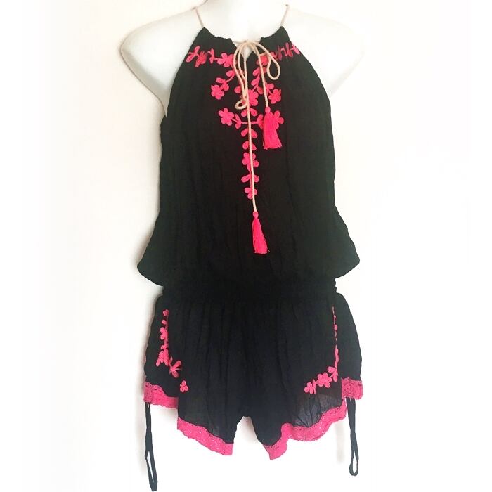 刺繍×ネオンタッセル リゾートロンパース (黒)海 ビーチ オールインワン【バリ島直輸入】