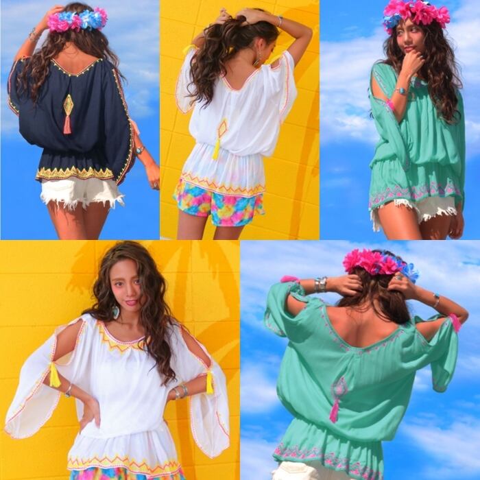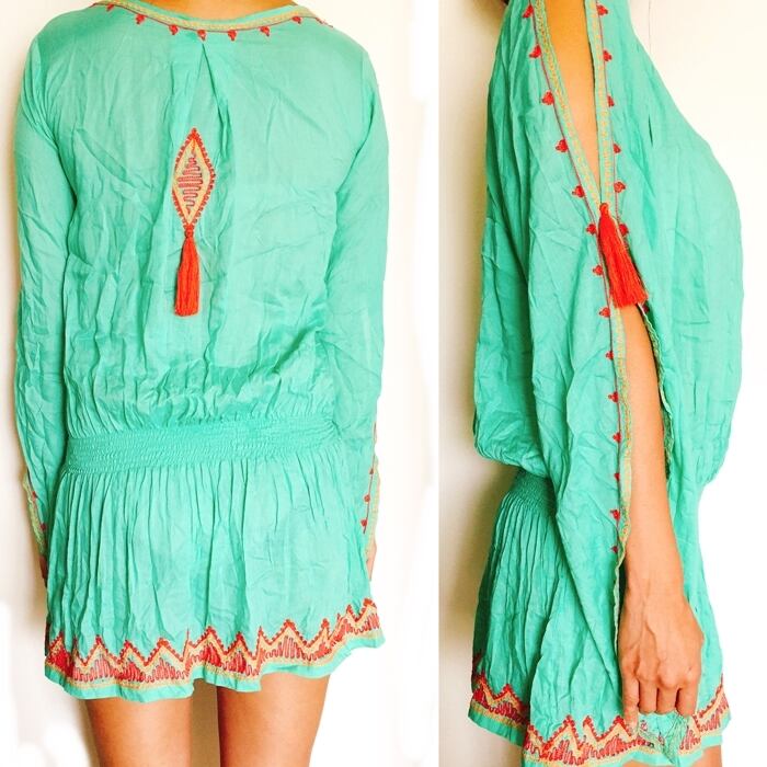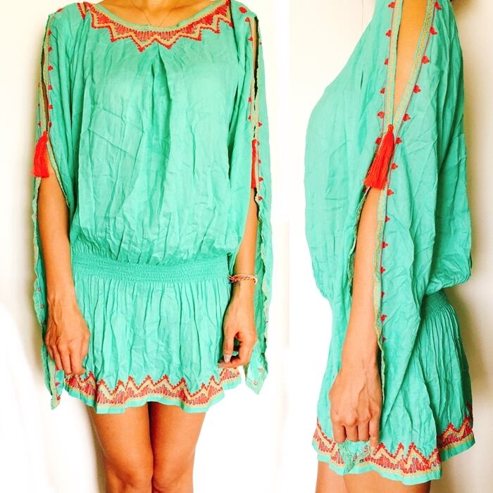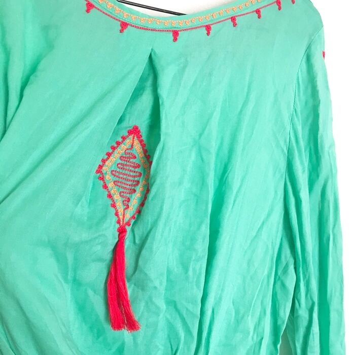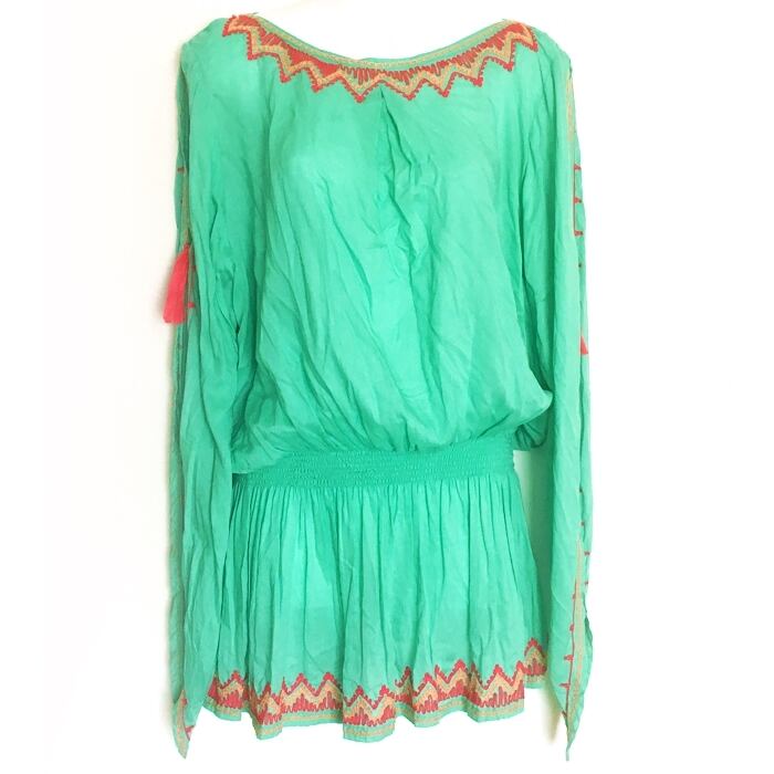 肩見せ!肌見せ! 刺繍×タッセル チュニックワンピ (グリーン)【バリ島直輸入】