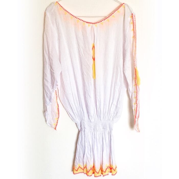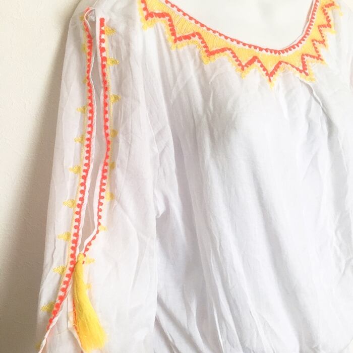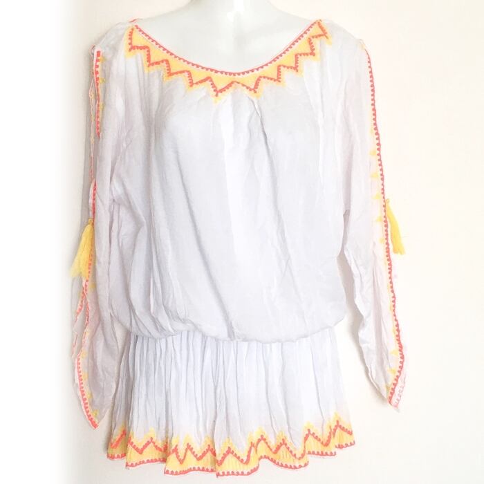 肩見せ!肌見せ! 刺繍×タッセル チュニックワンピ (ホワイト×イエロー)【バリ島直輸入】