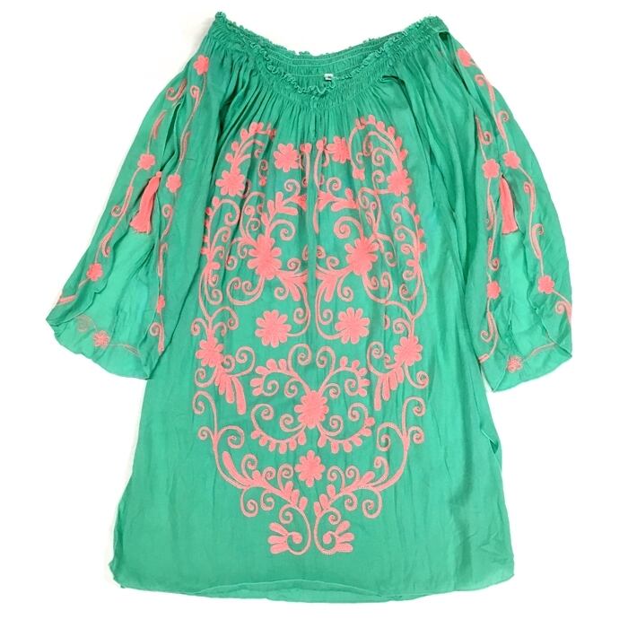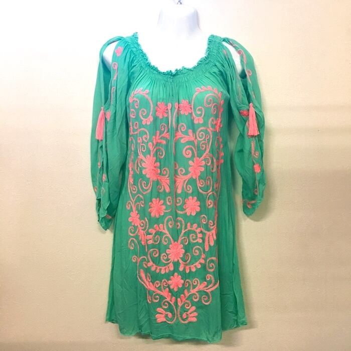刺繍×タッセル オフショルダー リゾートワンピース (グリーン)【バリ島直輸入】