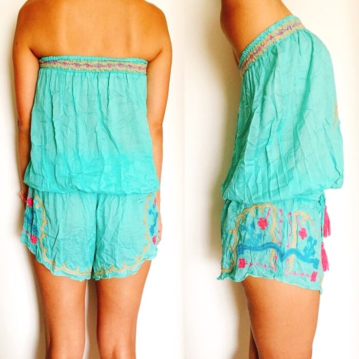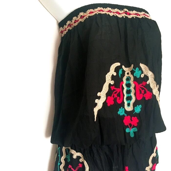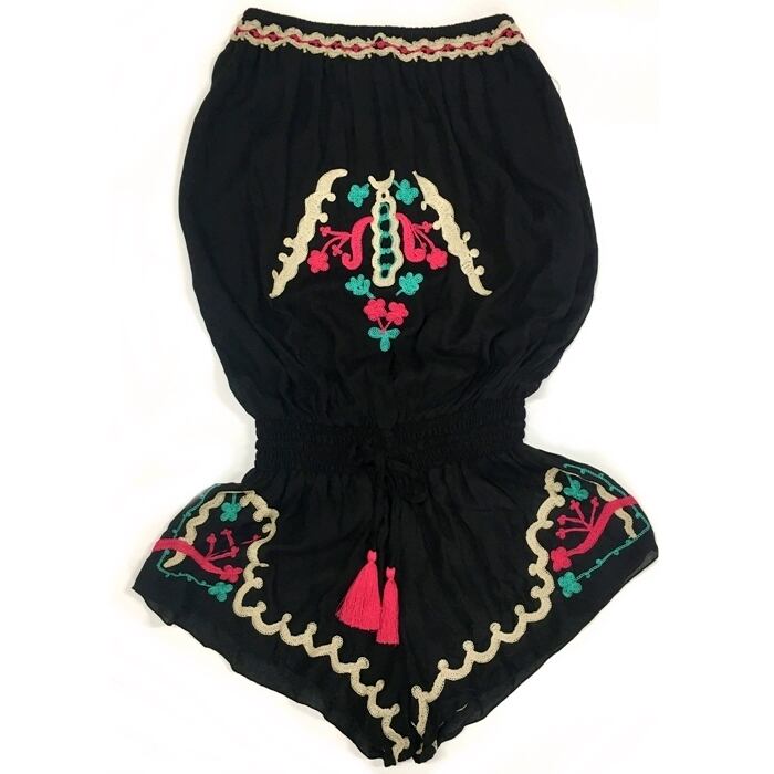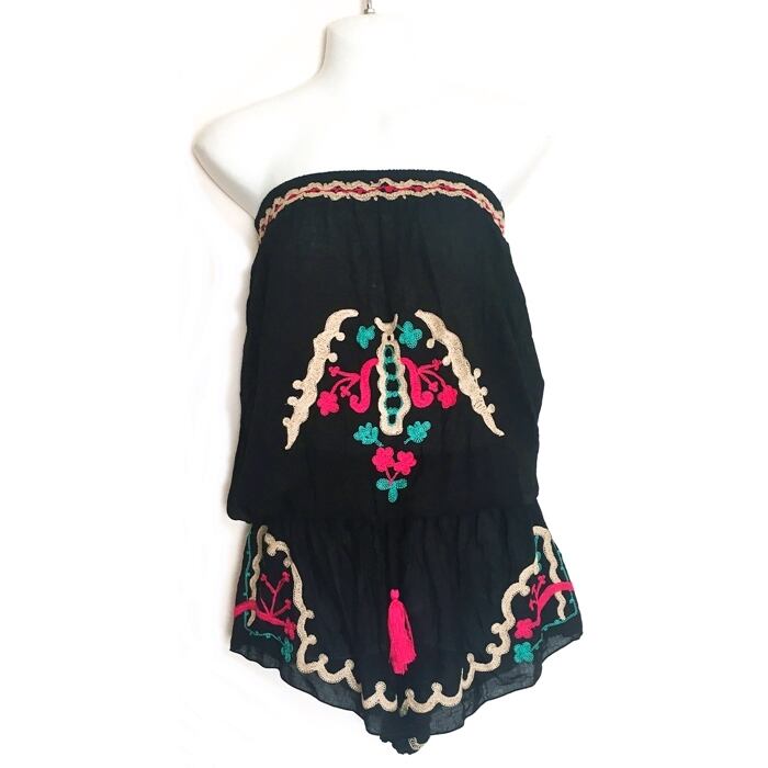 ベアトップ リゾートロンパース(ブラック)刺繍×タッセル【バリ島直輸入】