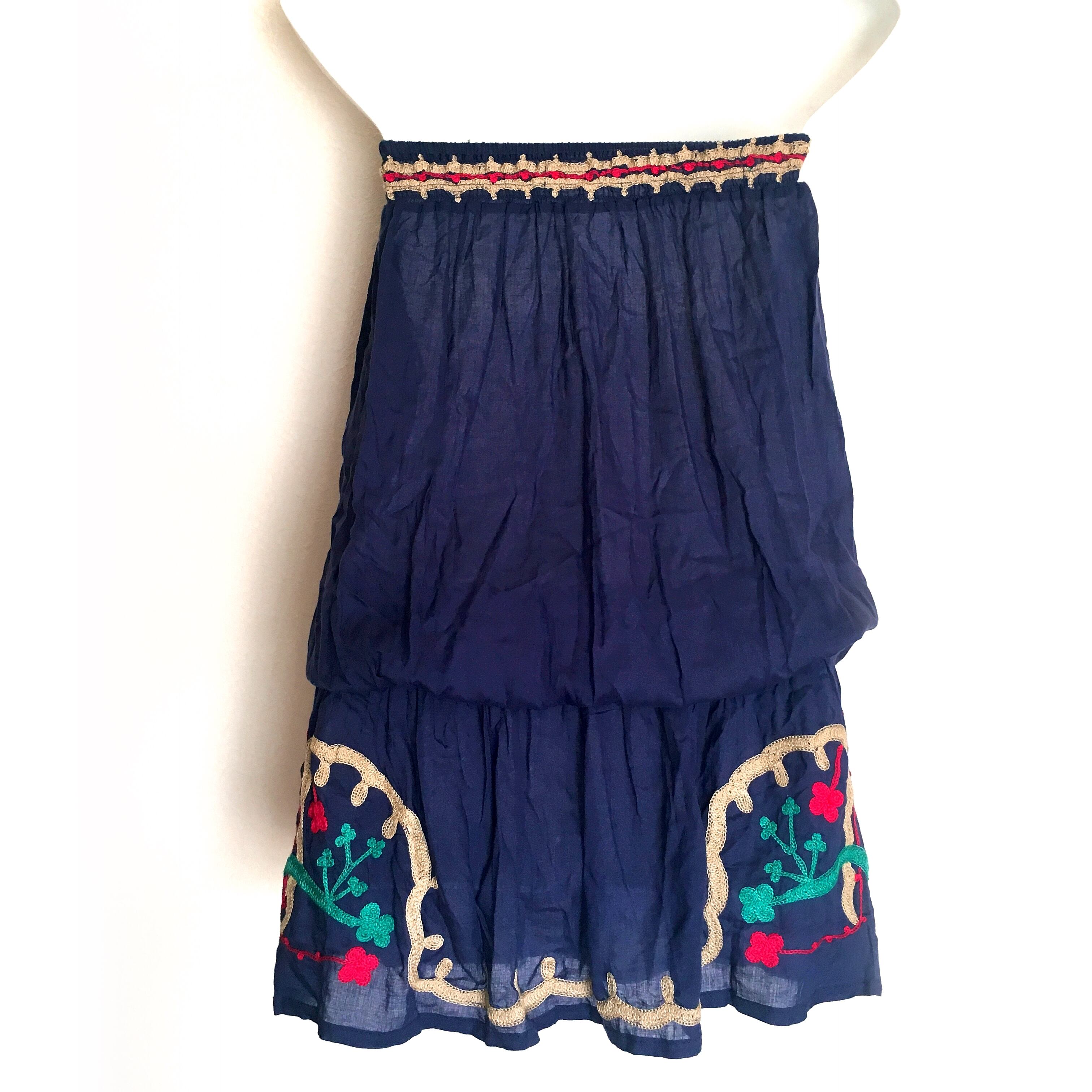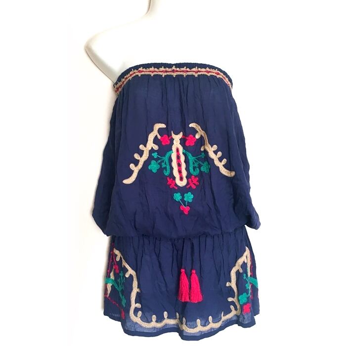 ベアトップ リゾートワンピース(ネイビー)刺繍×タッセル【バリ島直輸入】