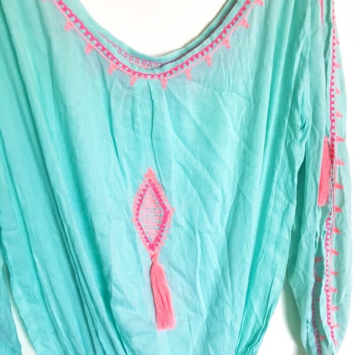 肩見せ!肌見せ! 刺繍×タッセル チュニックワンピ (ブルー)【バリ島直輸入】