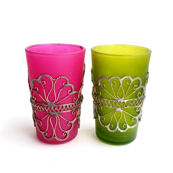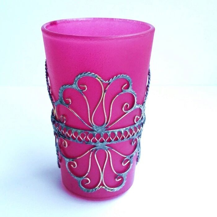 ミントティーグラス モロッコガラス フラワー型メタル(ピンク/グリーン)【モロッコ直輸入】