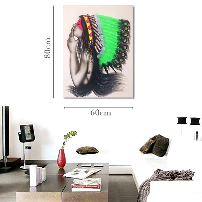 バリ キャンバスアート (ネイティブ インディアンガール×グリーン) 80×60cm これ1枚でお洒落なお部屋【バリ島直輸入】