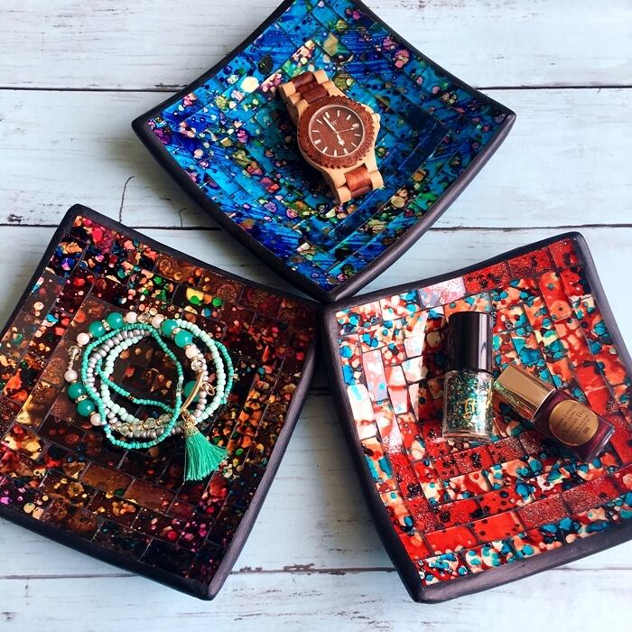 カラフル モザイクトレイ (レッドMIX×ブラック)小物入れ インテリア スクエアプレート【バリ島直輸入】