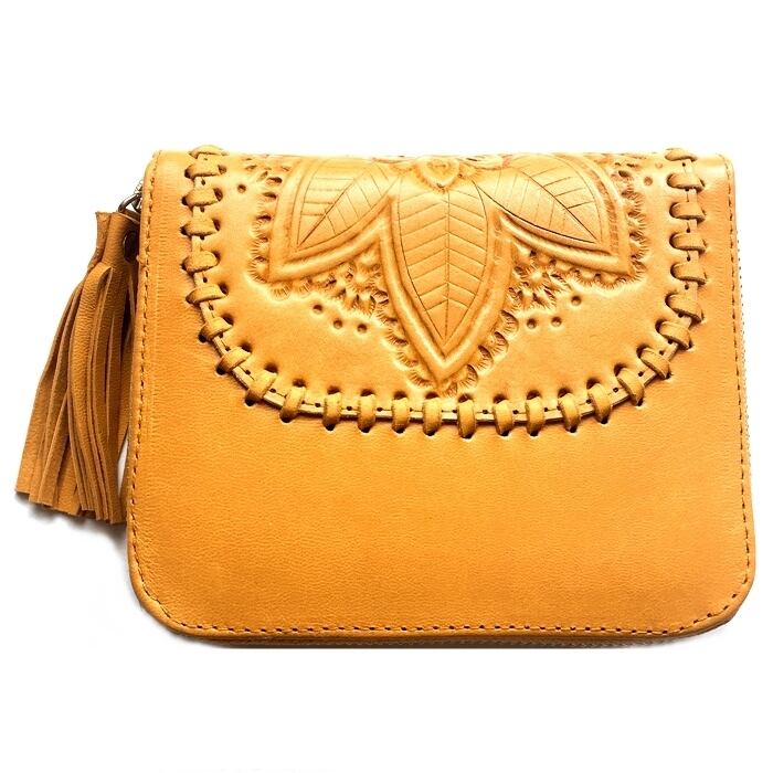 ボヘミアン レザー タッセル付 ウォレット(キャメル×マンダラ柄) 本革 財布 二つ折り財布 【バリ島直輸入】
