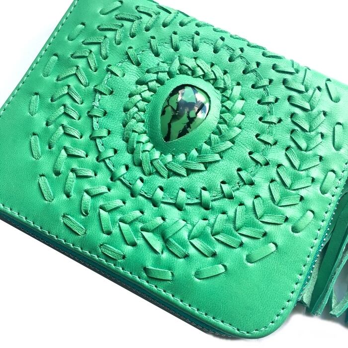 ボヘミアン レザー タッセル付 ウォレット(ターコイズグリーン×サークル刺繍ターコイズ) 本革 財布 二つ折り財布 【バリ島直輸入】