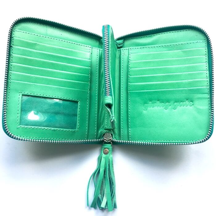 こちらの商品は鮮やかなターコイズグリーンのレザーに