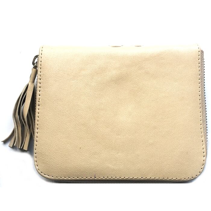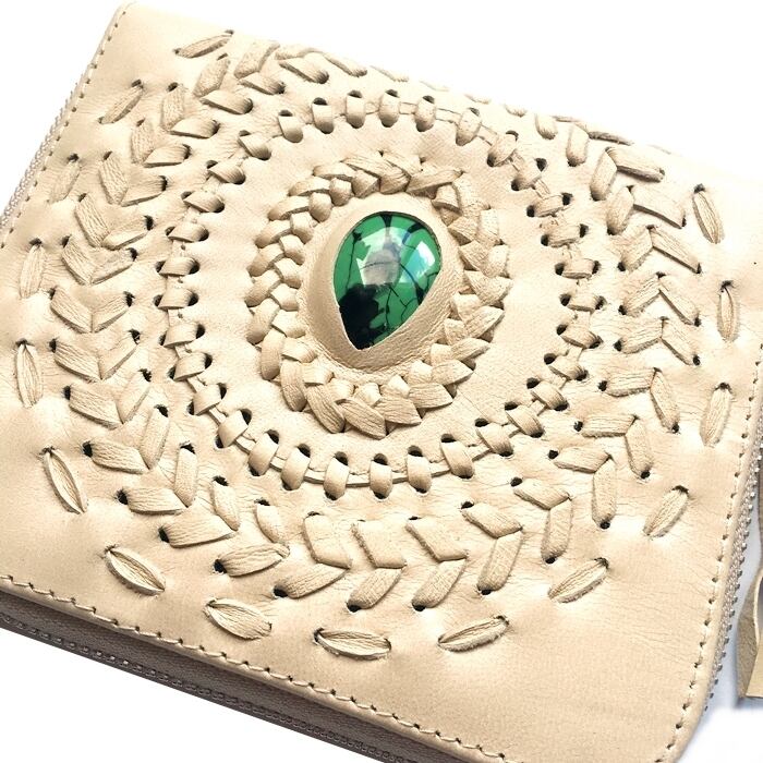 ボヘミアン レザー タッセル付 ウォレット(アイボリー×サークル刺繍ターコイズ) 本革 財布 二つ折り財布 【バリ島直輸入】