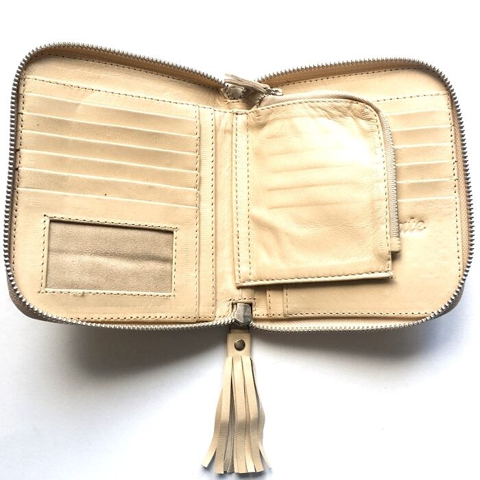 その周りを同色のレザーでサークル刺繍が施されたアクセントがかわいいお財布。