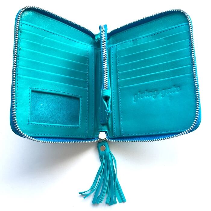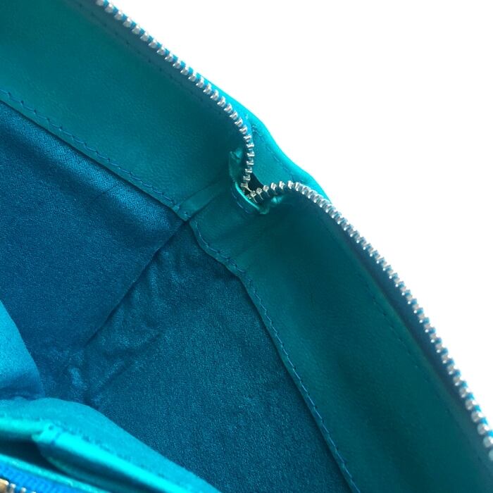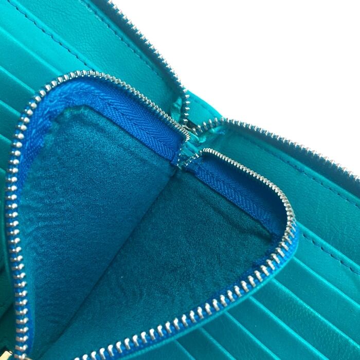 こちらの商品は鮮やかなターコイズブルーのレザーに