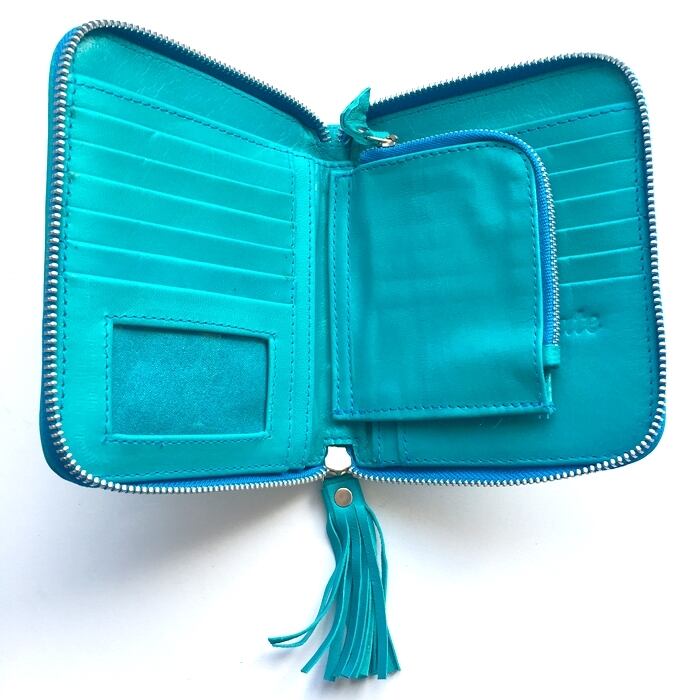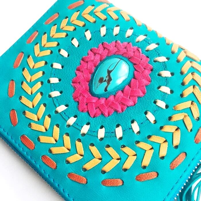 ボヘミアン レザー タッセル付 ウォレット(ターコイズブルー×サークルMIX刺繍ターコイズ) 本革 財布 二つ折り財布 【バリ島直輸入】