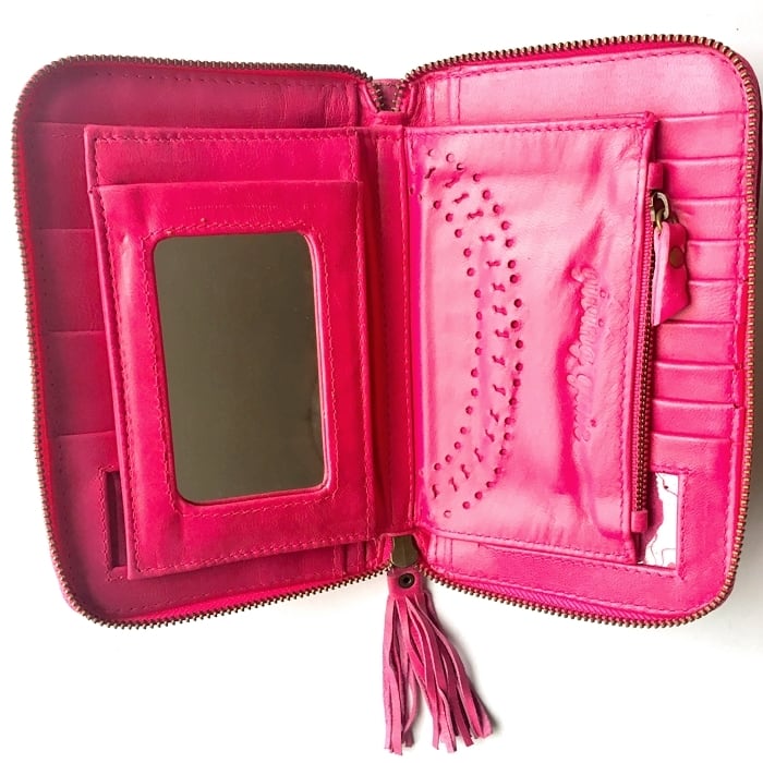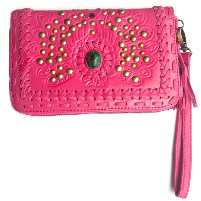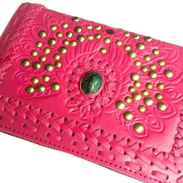ボヘミアン 本革 レザー タッセル付 ウォレット(ピンク×スタッズ×ターコイズ) ミラー付 財布 長財布 パスポート入れ【バリ直輸入】