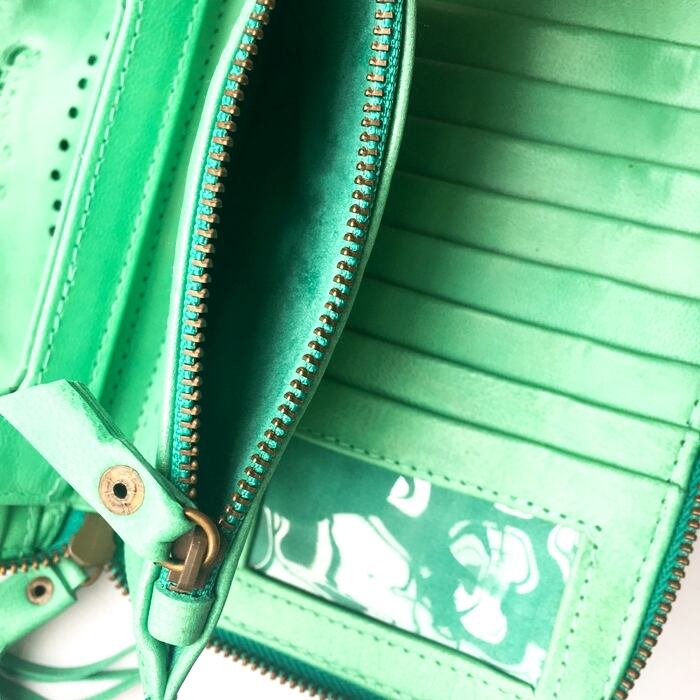 こちらの商品は鮮やかなターコイズグリーンのレザーで、