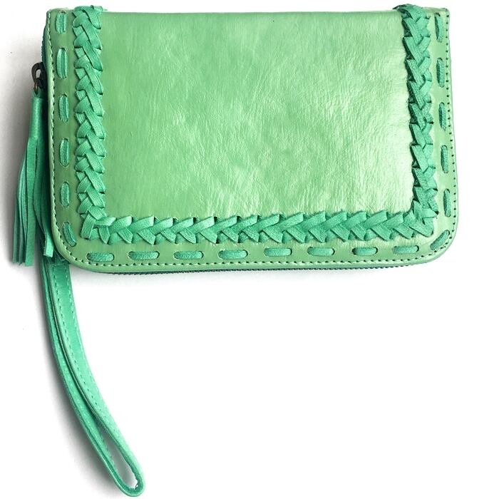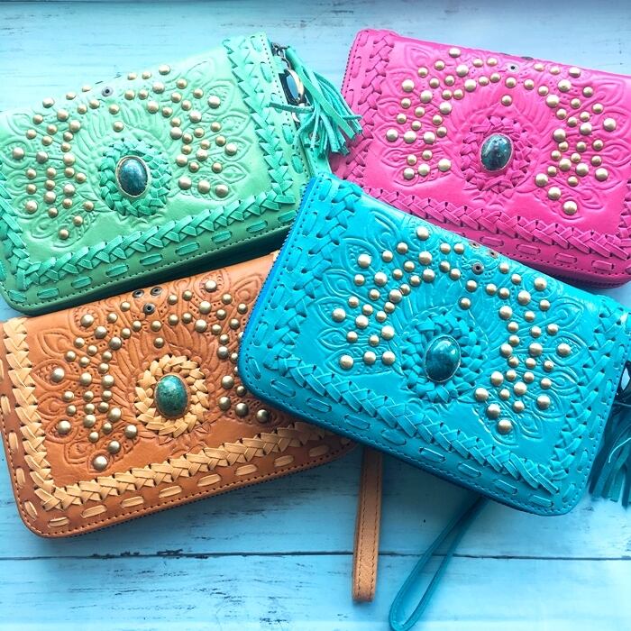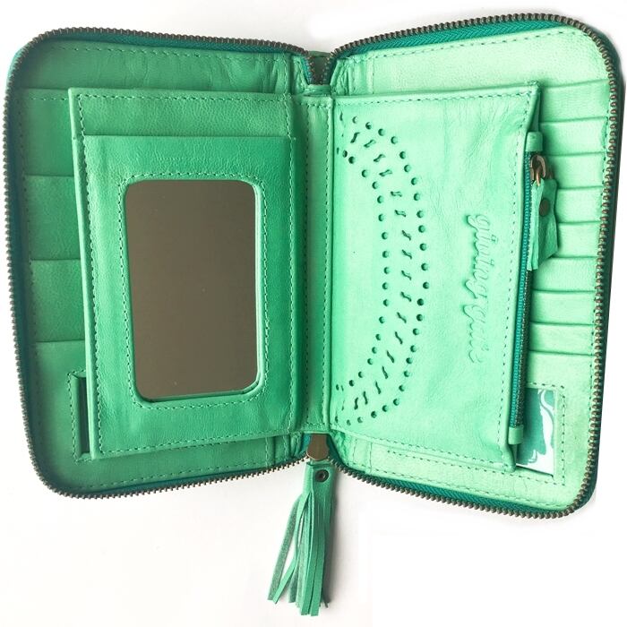 ボヘミアン 本革 レザー タッセル付 ウォレット(グリーン×スタッズ×ターコイズ) ミラー付 財布 長財布 パスポート入れ【バリ直輸入】