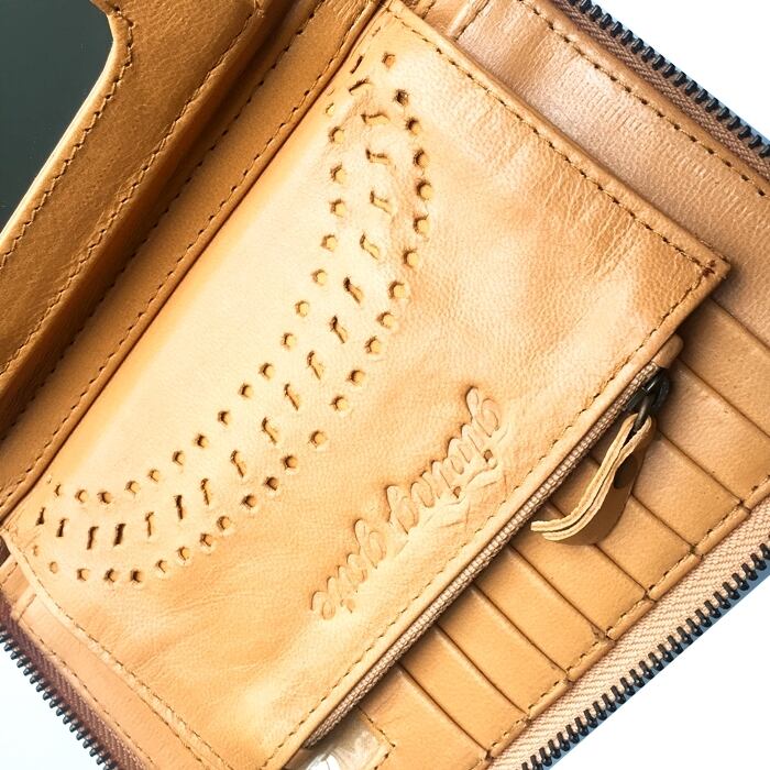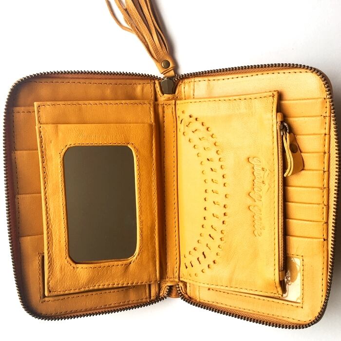 ボヘミアン 本革 レザー タッセル付 ウォレット(キャメル×スタッズ×ターコイズ) ミラー付 財布 長財布 パスポート入れ【バリ直輸入】