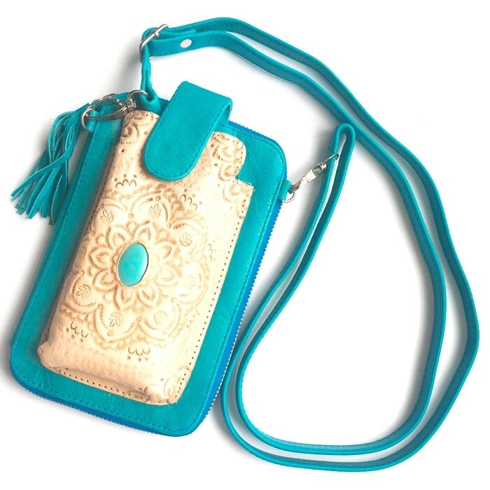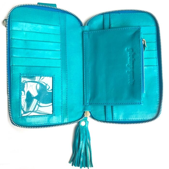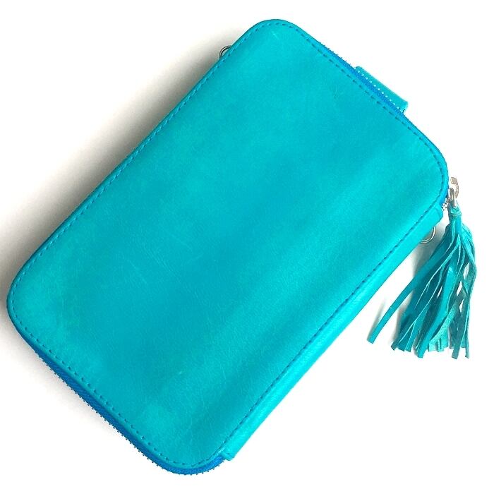 ボヘミアン 本革 レザー タッセル付 ウォレット(ターコイズブルー×スマホケース) 財布 長財布 ショルダー付 パスポート入れ【バリ直輸入】