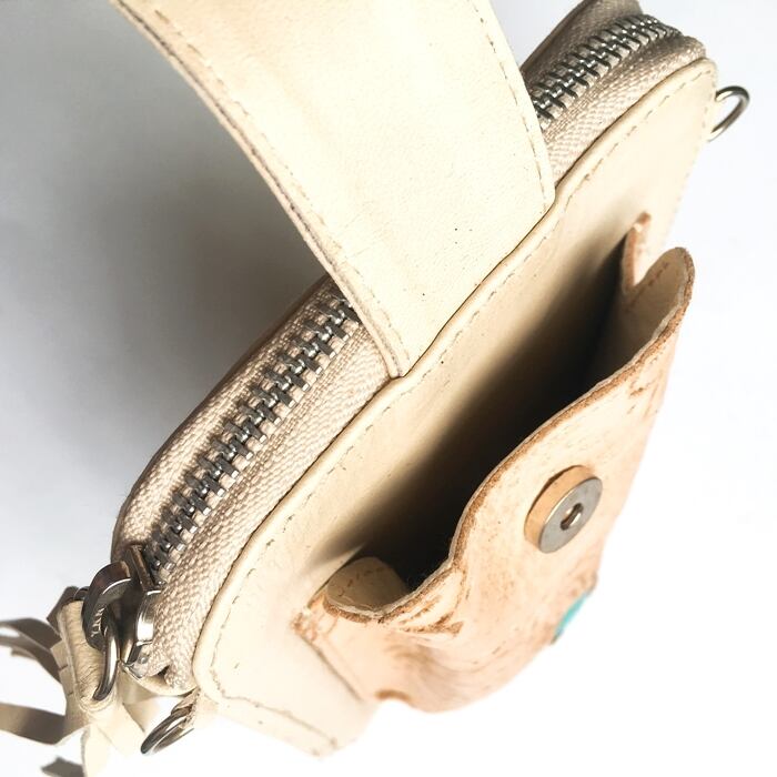ナチュラルカラーのレザーでできたスマホもすっぽり収まるポケットが付いていて