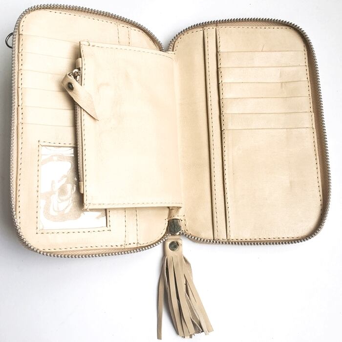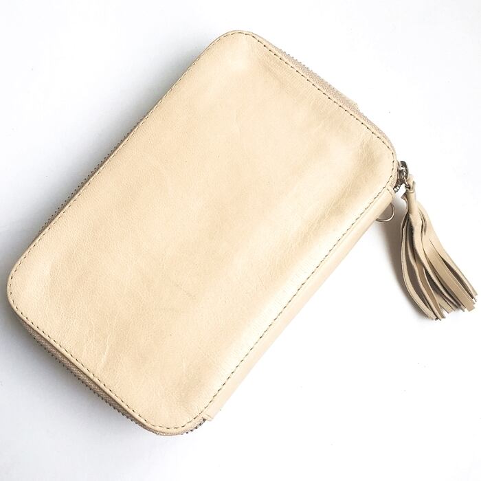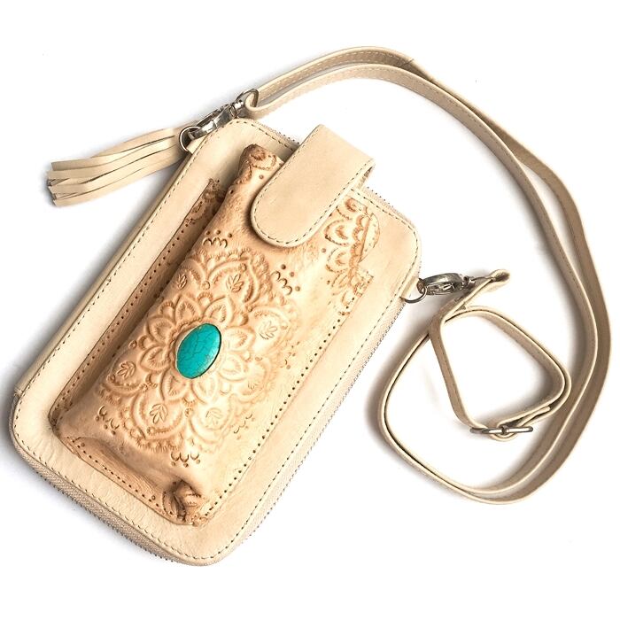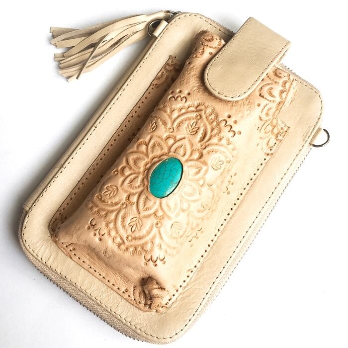 ボヘミアン 本革 レザー タッセル付 ウォレット(アイボリー×スマホケース) 財布 長財布 ショルダー付 パスポート入れ【バリ直輸入】