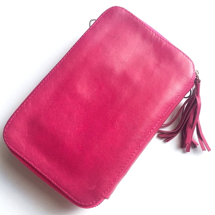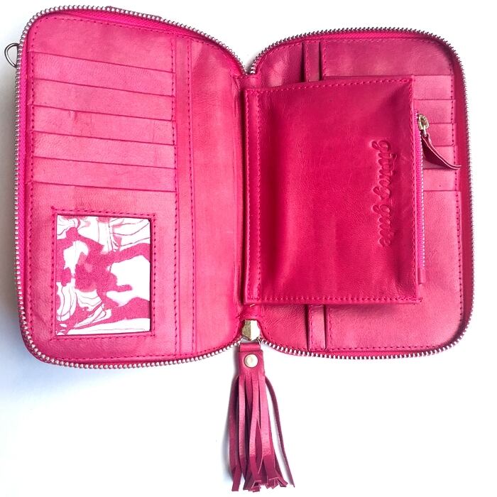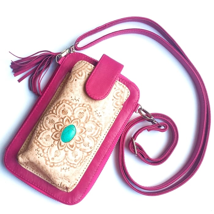 ボヘミアン 本革 レザー タッセル付 ウォレット(ピンク×スマホケース) 財布 長財布 ショルダー付 パスポート入れ【バリ直輸入】