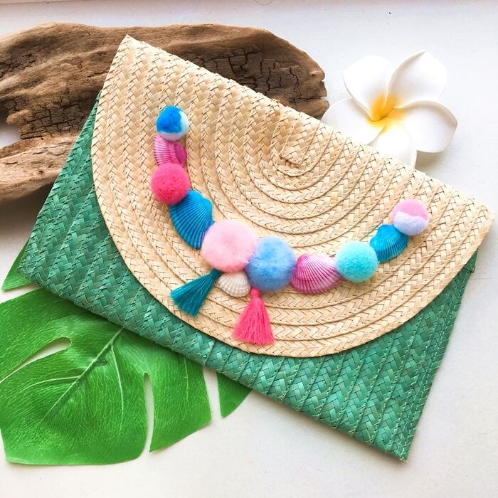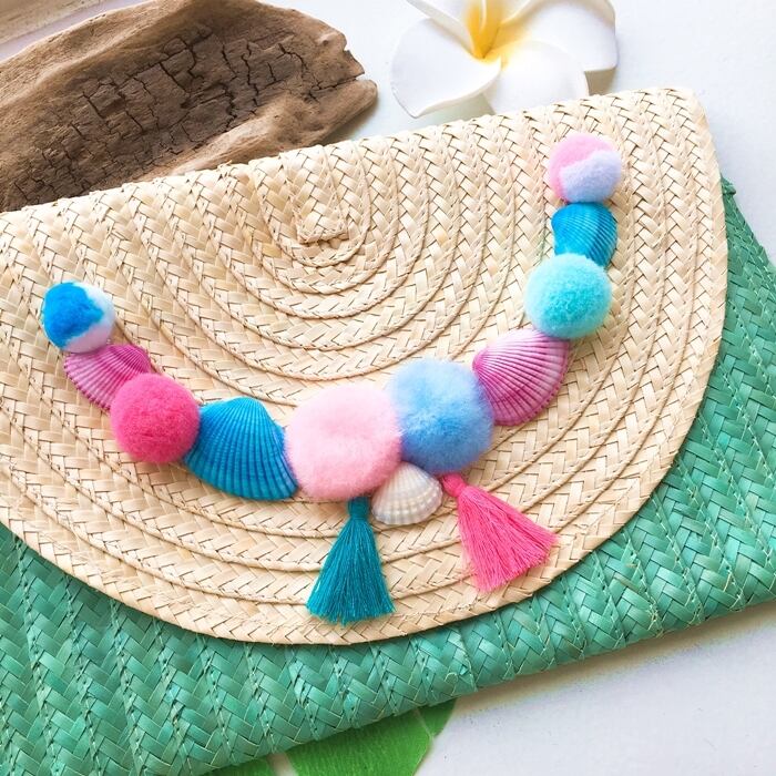 カラフルな配色のポンポンやシェルやタッセルで可愛いバッグに仕上げました。